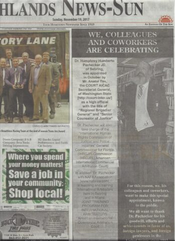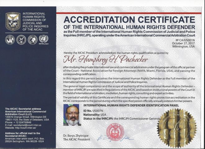 Mensaje del presidente de la Comisión de Derechos Humanos de la Corte AICACHR, Washington DC, unido el mismo a la directiva de NAFA LAW Dr. Humberto H Pachecker: